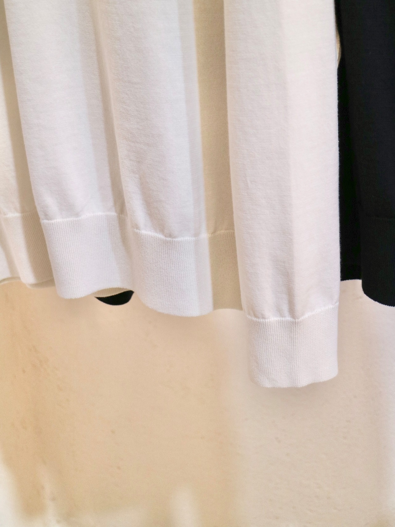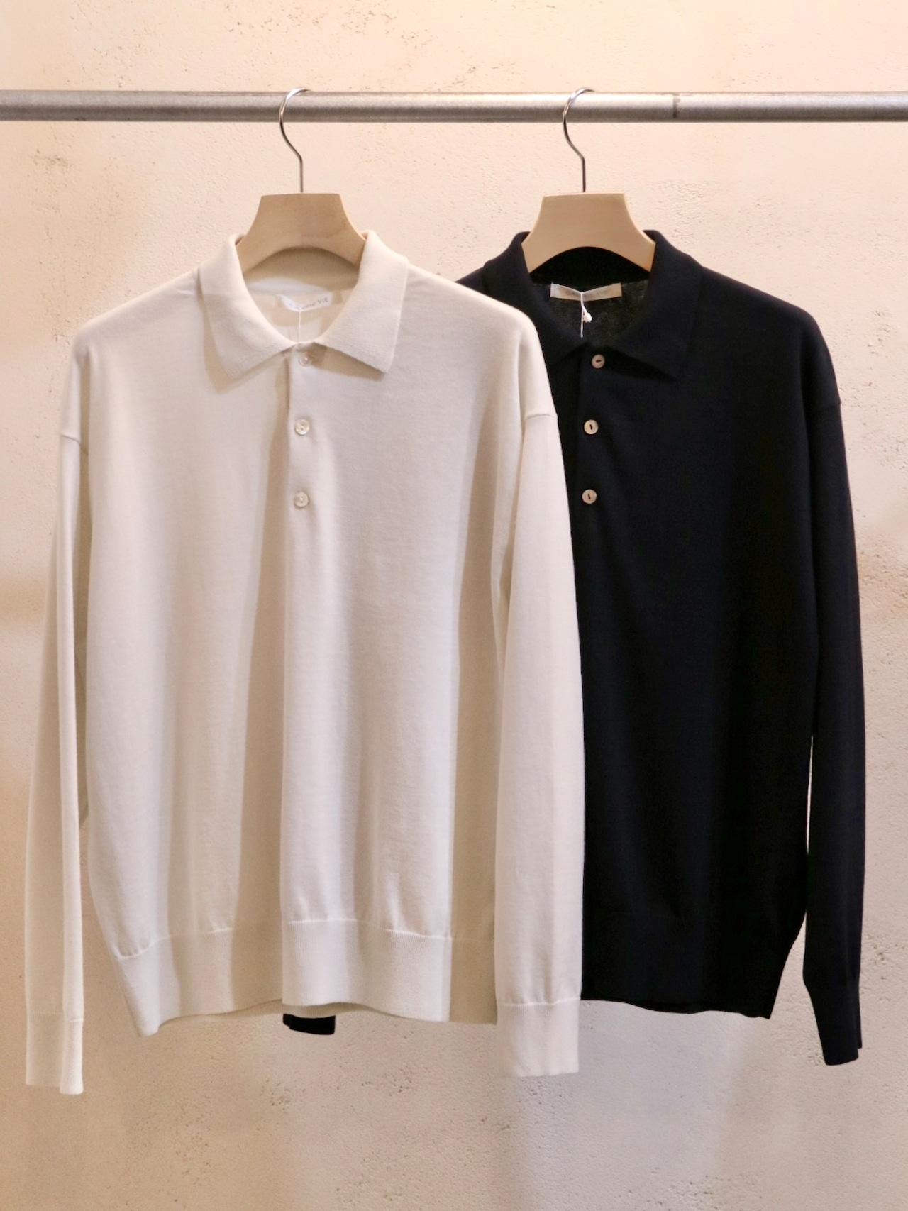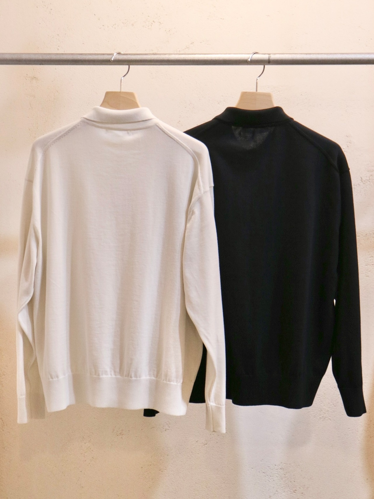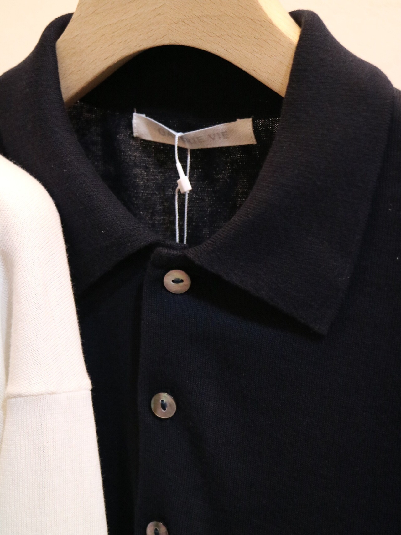 強撚糸で編まれたクリーンな表情のニットで通常の鹿の子ポロに比べ上品に。