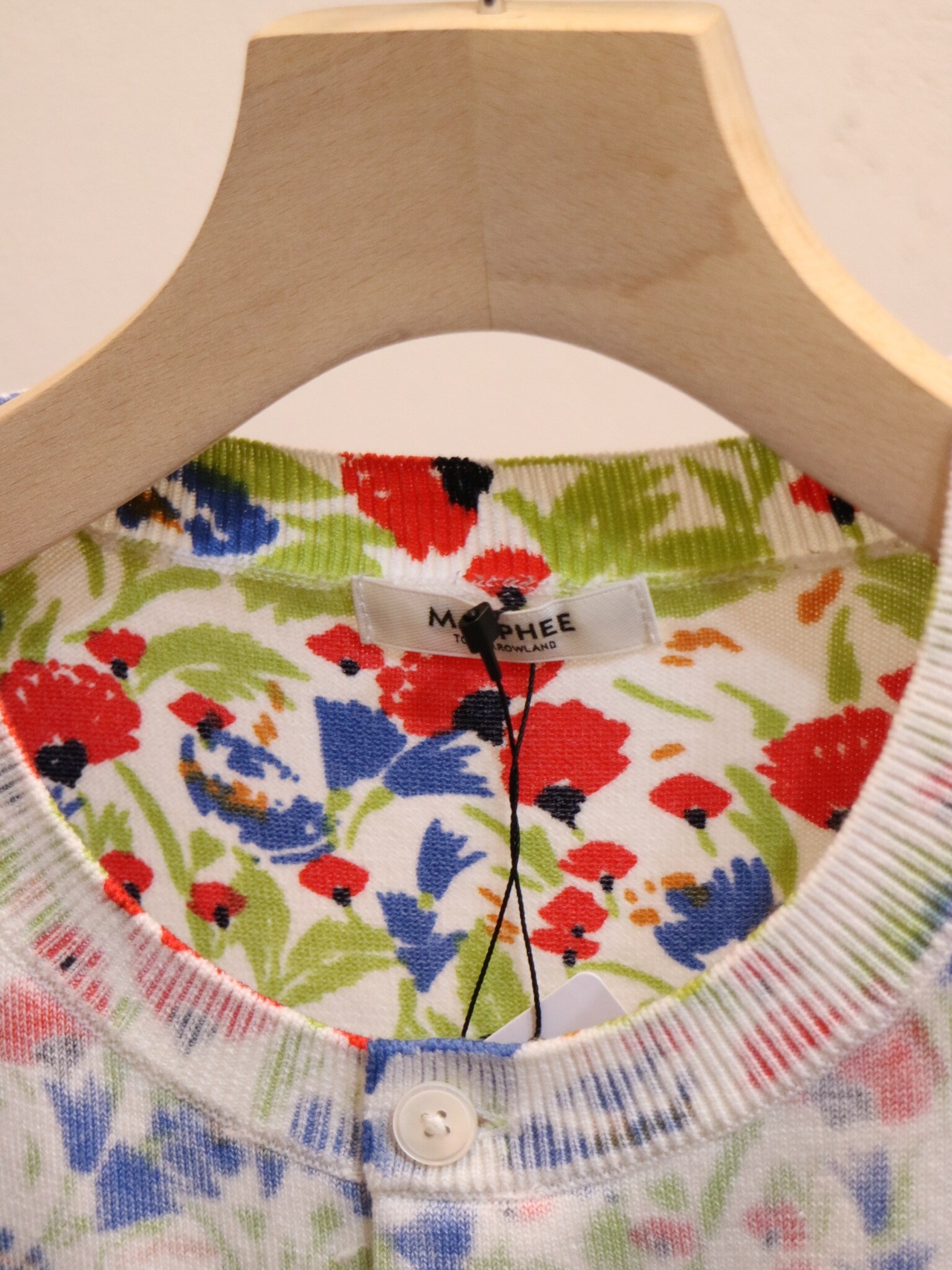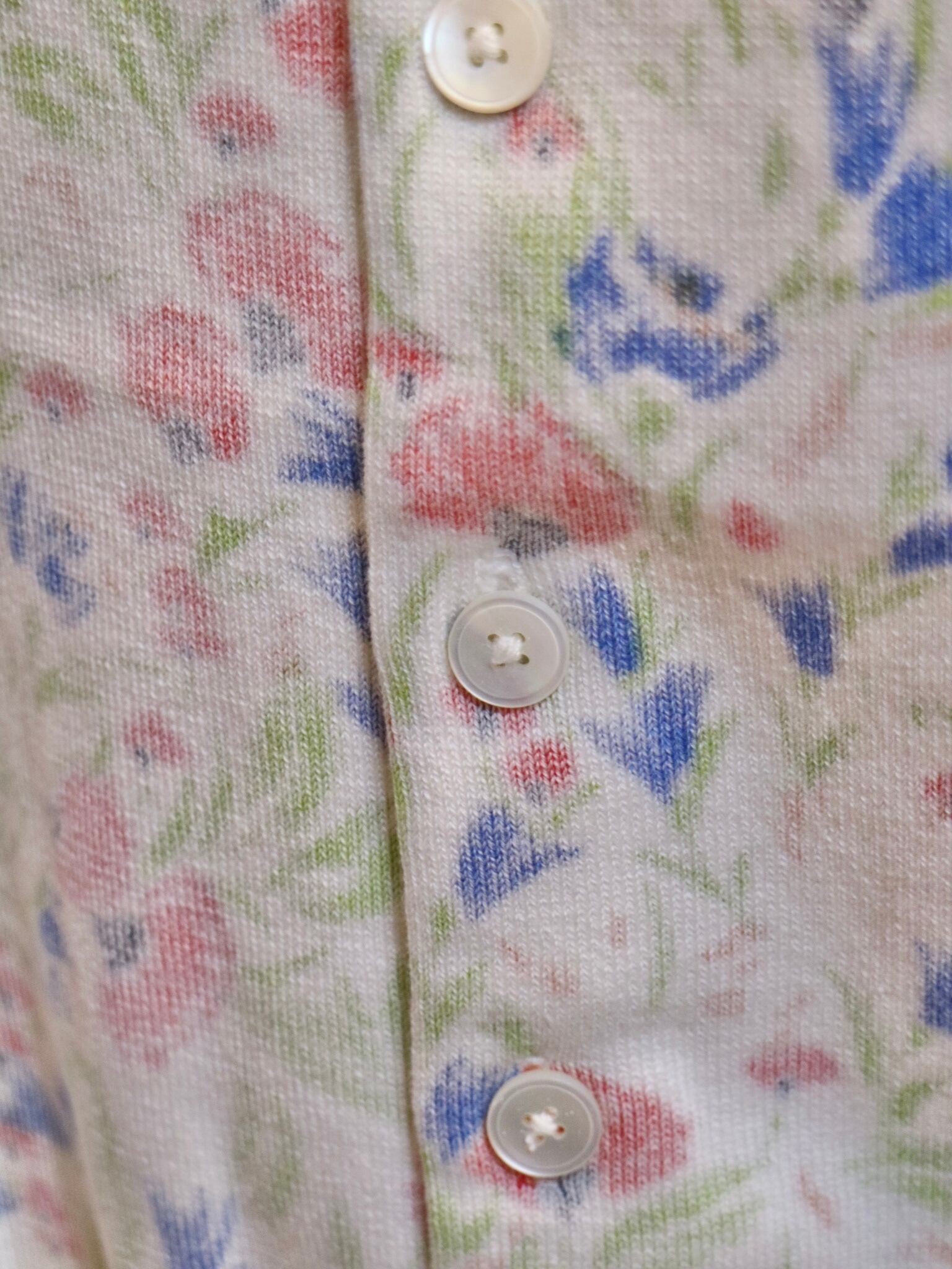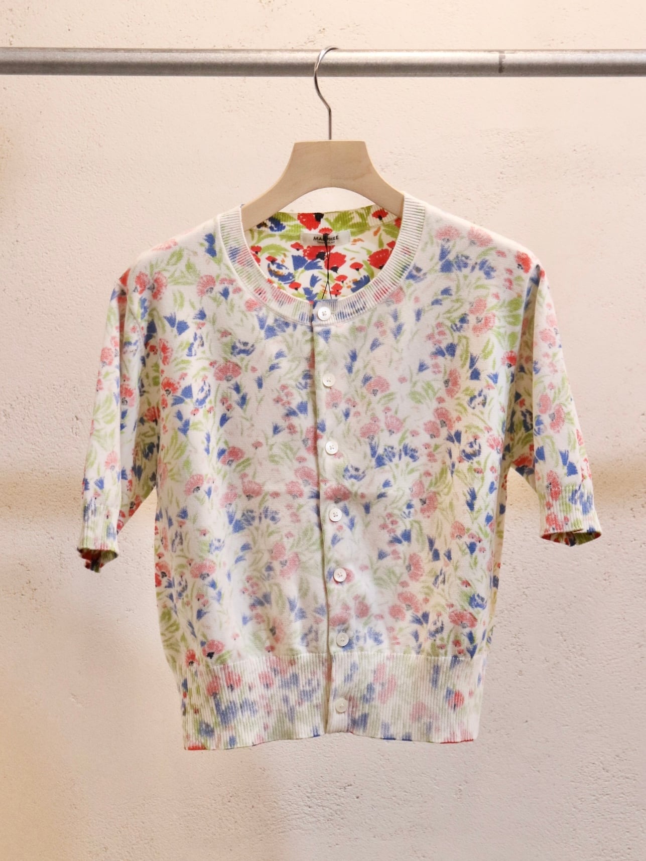 花柄のニットプリント生地を裏で使ったコンパクトなカーディガン。