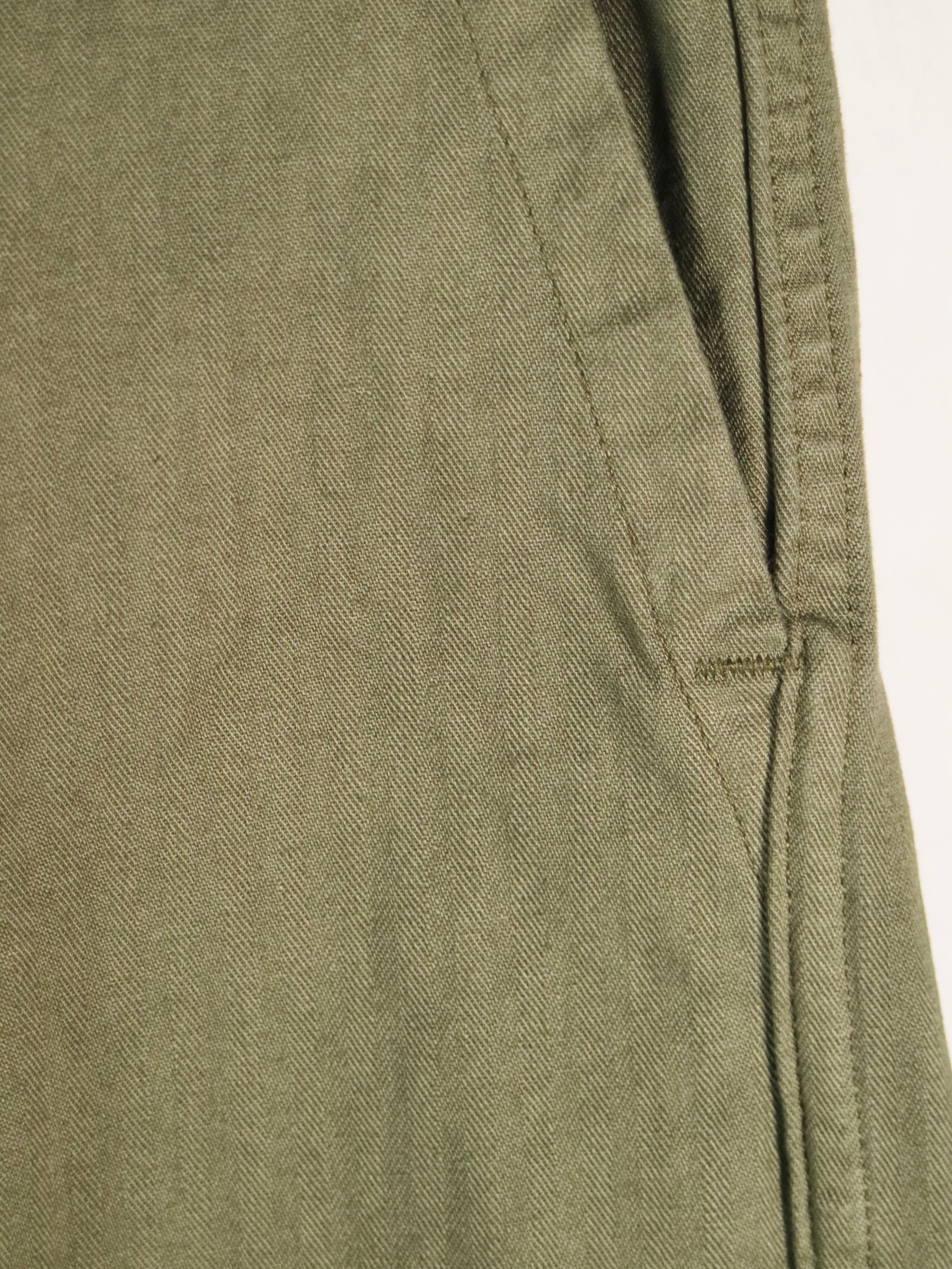 ヒップやワタリなどが大きめになっておりベースのフレンチワークパンツよりカジュアルに。