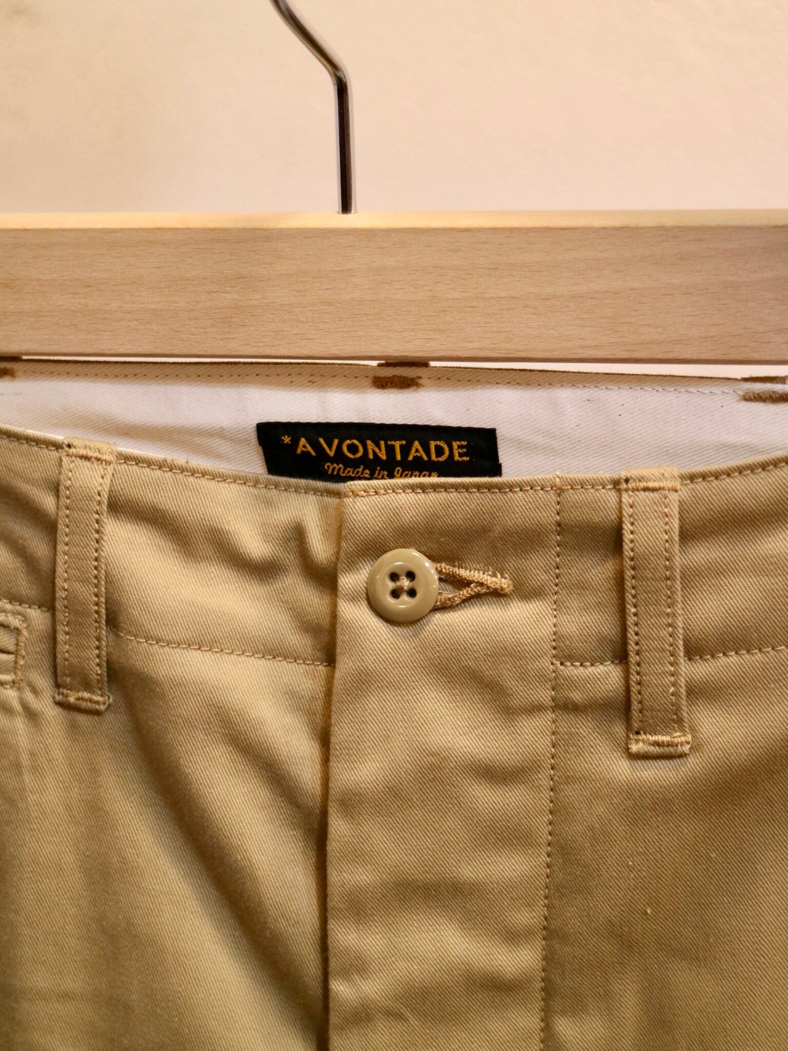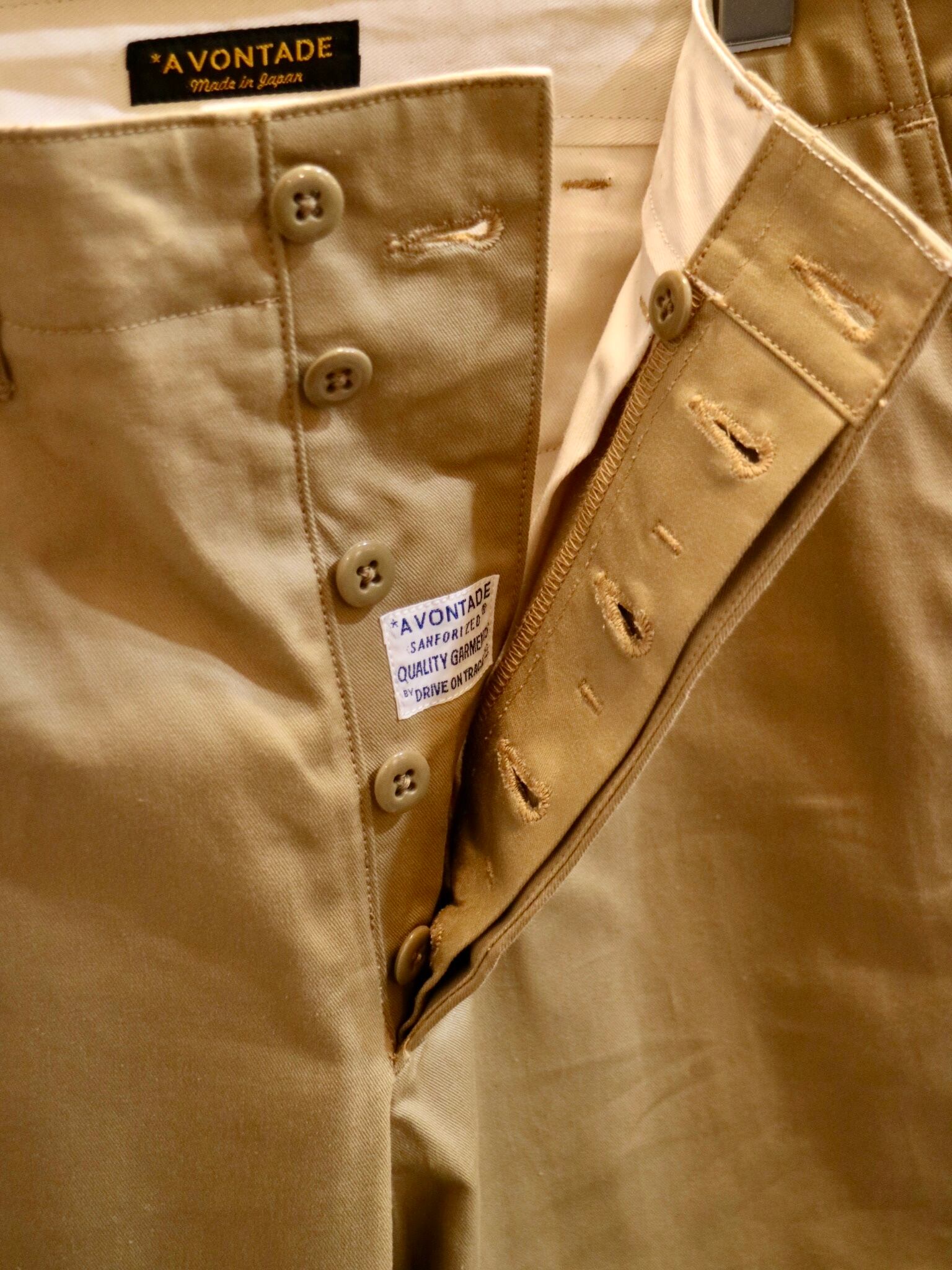 定番のチノトラウザーズの素材を使用し45カーキと呼ばれる1945年の米軍のチノパンをもとに製作。